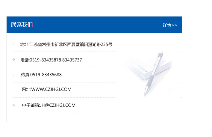 地址:常州市新北區友邦商務大廈1幢16、17層  電話:0519-85101652  傳真:0519-85112595  郵編:213022  網址:www.cz-jiayue_cn.bjbeishengweiye.com  郵箱:xiajifengaa@163.com